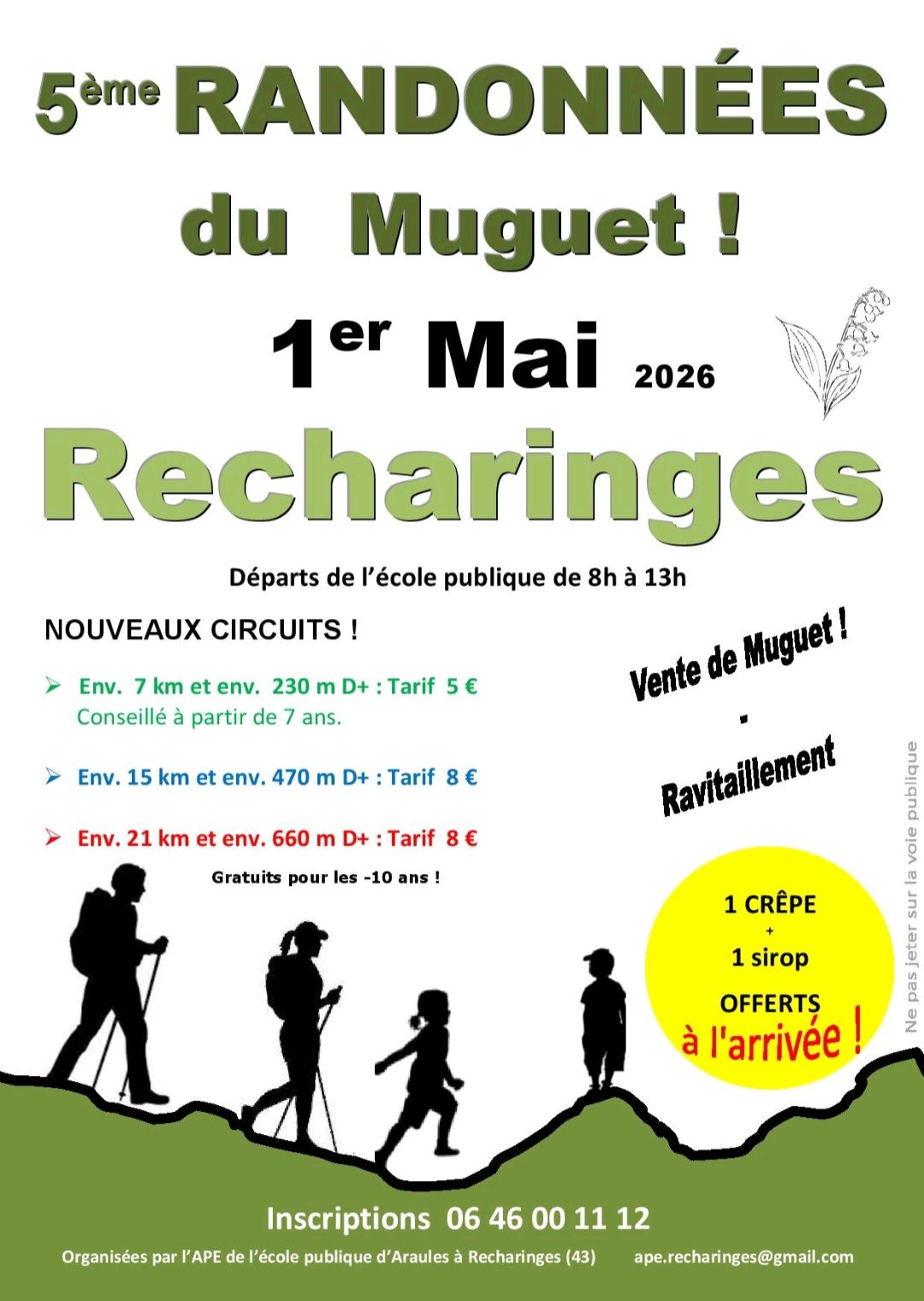 Nouveaux circuits ! 7 km : conseillé à partir de 7 ans - 15 km - 21 km. Ravitaillement - Vente de Muguet. Et à l'arrivée, 1 crêpe + 1 sirop offerts !
