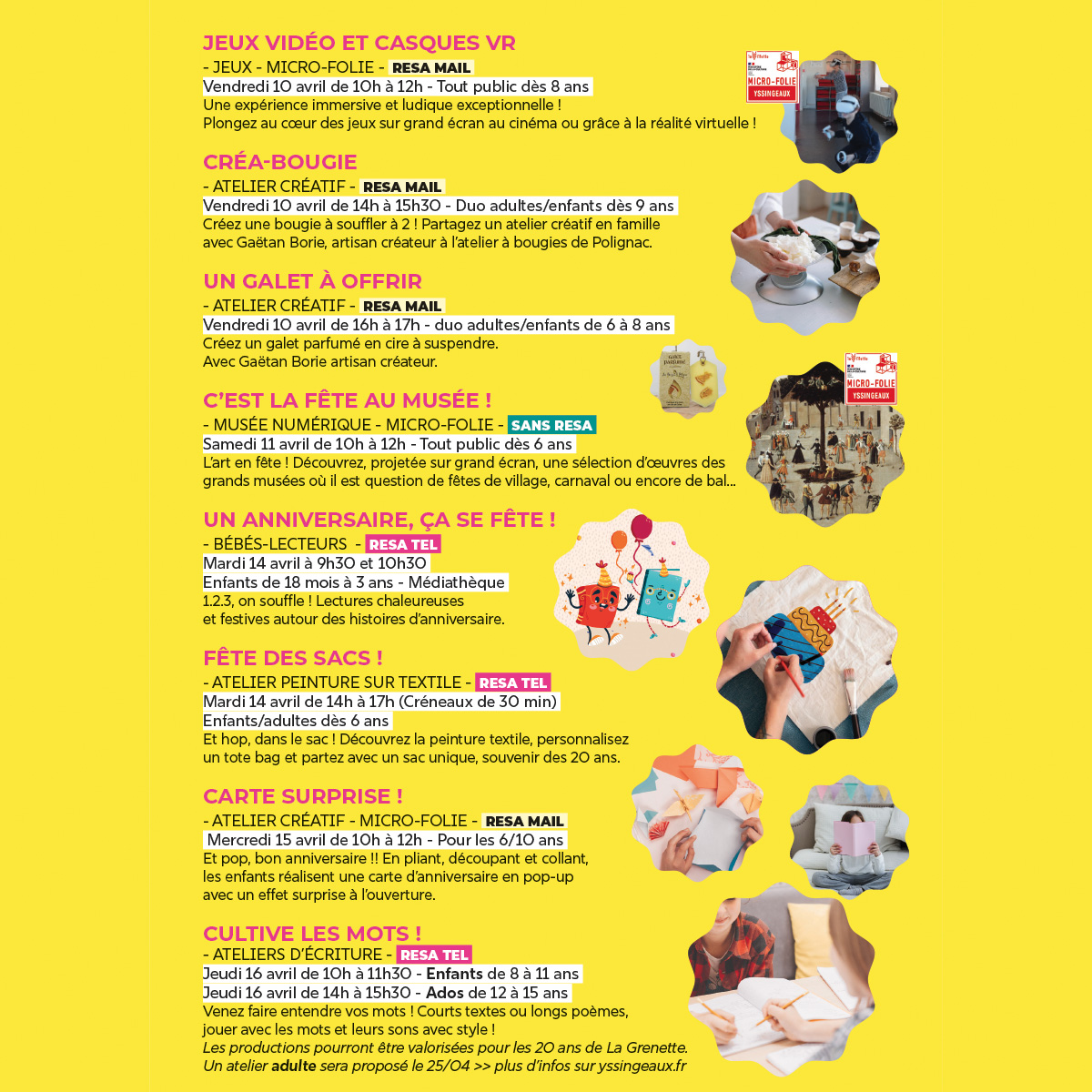A destination des enfants : atelier créatif et musical, atelier cinéma, création de bougie, jeux vidéo et casques VR, atelier peinture sur textile, atelier d'écriture... Il y en aura pour tous les goûts et tous les âges ! Sur inscription par mail.