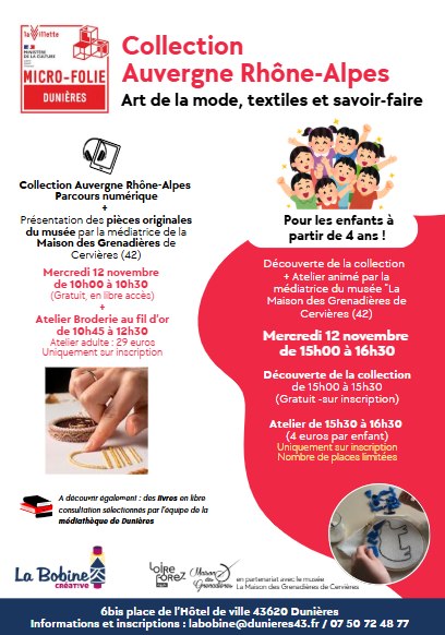 De 10h à 10h45 et de 14h à 14h45 : collection Auvergne Rhône-Alpes, art de la mode textile et savoir faire. Ouvert à tous , gratuit.