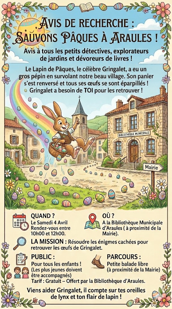 SOS - SAUVONS PAQUES ! Nous avons besoin de vous pour aider notre lapin à retrouver ses œufs ! Rendez-vous pour une chasse aux énigmes : Récompense offerte ! Pour les enfants à partir de 2/3 ans accompagnés. Gratuit !