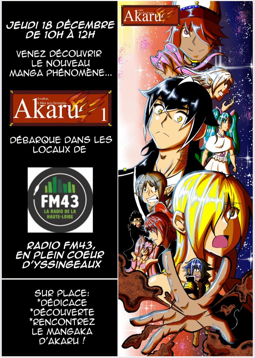Matthieu Badiou créateur d’Akaru sera en rencontre / dédicace dans les locaux de la radio FM 43 de 10h à 12h ! Profitez de l’occasion pour le rencontrer, découvrir ou redécouvrir Akaru, l’univers Manga. Le manga est aussi une très bonne idée cadeau !