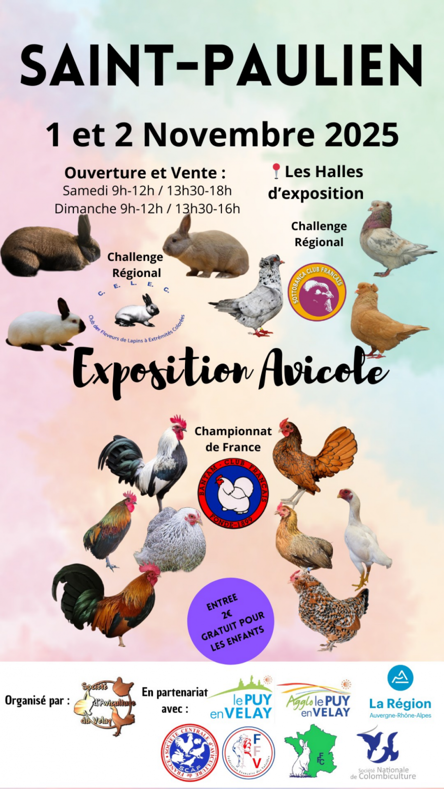 Venez découvrir des dizaines de races de volailles, lapins et pigeons lors de cette grande Exposition Avicole, avec près de 1000 animaux présentés est une visite à ne pas manquer ou vous pourrez admirer des animaux de toute beauté.