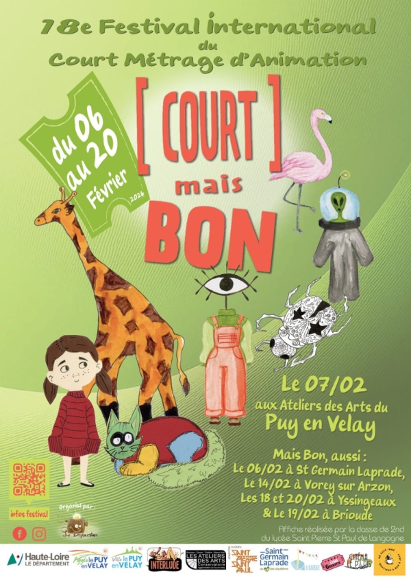 Dans le cadre du festival d'animation "Court Mais Bon", en partenariat avec le cinéma "la Grenette" et l"association "cinéma m'était conté" à Yssingeaux seront projetés les "Bravos" : une sélection des court métrages les plus plébiscités par le public durant le concours 2026.