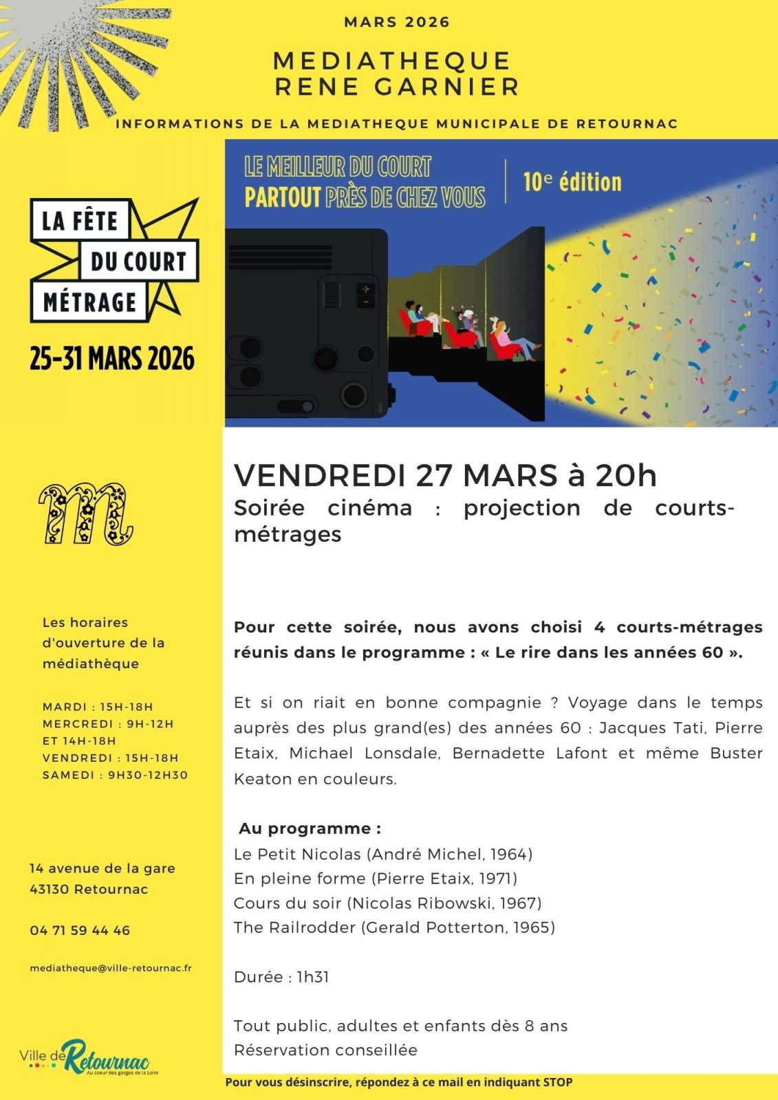 Pour cette soirée, la médiathèque a choisi 4 courts-métrages réunis dans le programme : "Le rire dans les années 60". Soirée tout public, adultes et enfants dès 8ans. Durée : 1h31. Réservation conseillée.