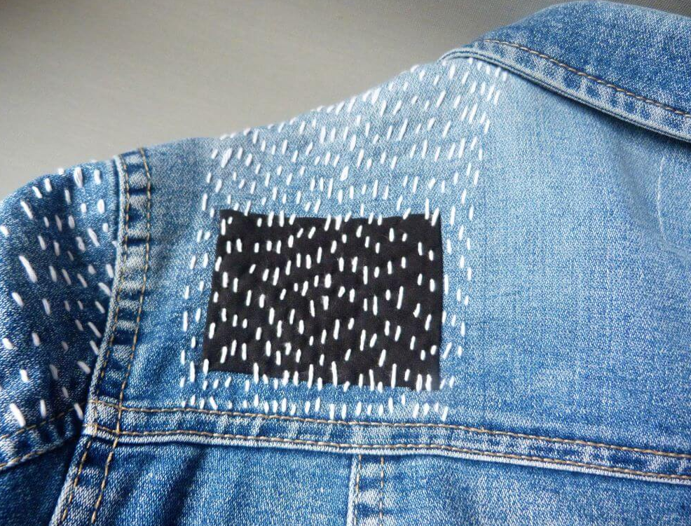 Venue du Japon, cette technique permet de repriser un vêtement en mêlant de la broderie sashiko (petit point de la taille d’un grain de riz) et des empiècements en tissus.