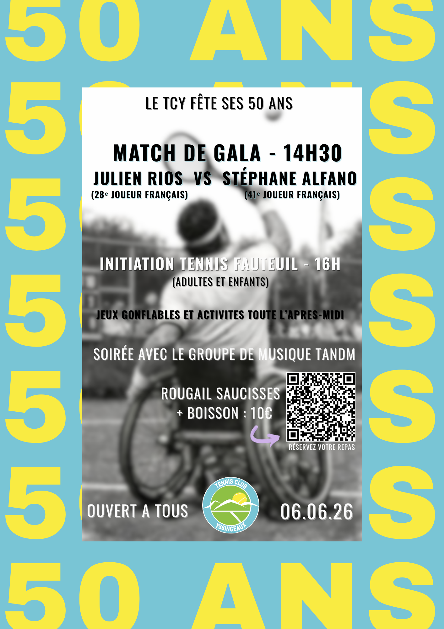 Le Tennis Club Yssingeaux (TCY) célèbre ses 50 ans avec un programme varié incluant un match de gala, une initiation au tennis fauteuil, des jeux gonflables et une soirée musicale. Un repas rougail saucisses est également proposé.