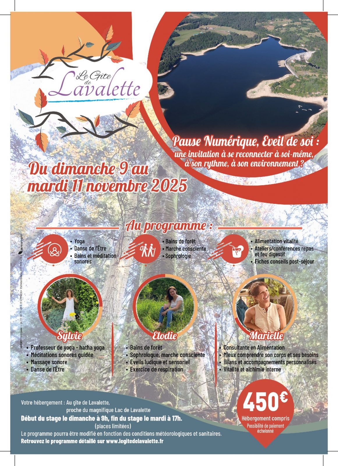 Et si l’automne devenait votre saison intérieure ? Un grand gîte chaleureux, un lac paisible, la nature flamboyante… Bains de forêts, bains sonores, alimentation saine. Moments de douceur et reconnexion à soi. Du 9 au 11 novembre. Sur réservation.