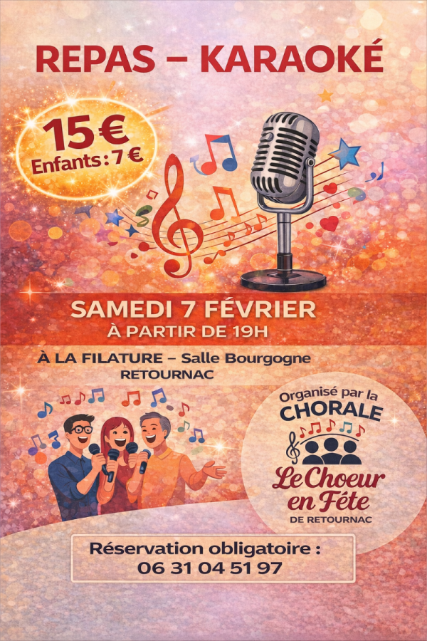 La chorale " LE CHOEUR EN FETE DE RETOURNAC" organise un " REPAS - KARAOKE". Le repas sera proposé à partir de 19h (sur réservation). Ouvert à tous !