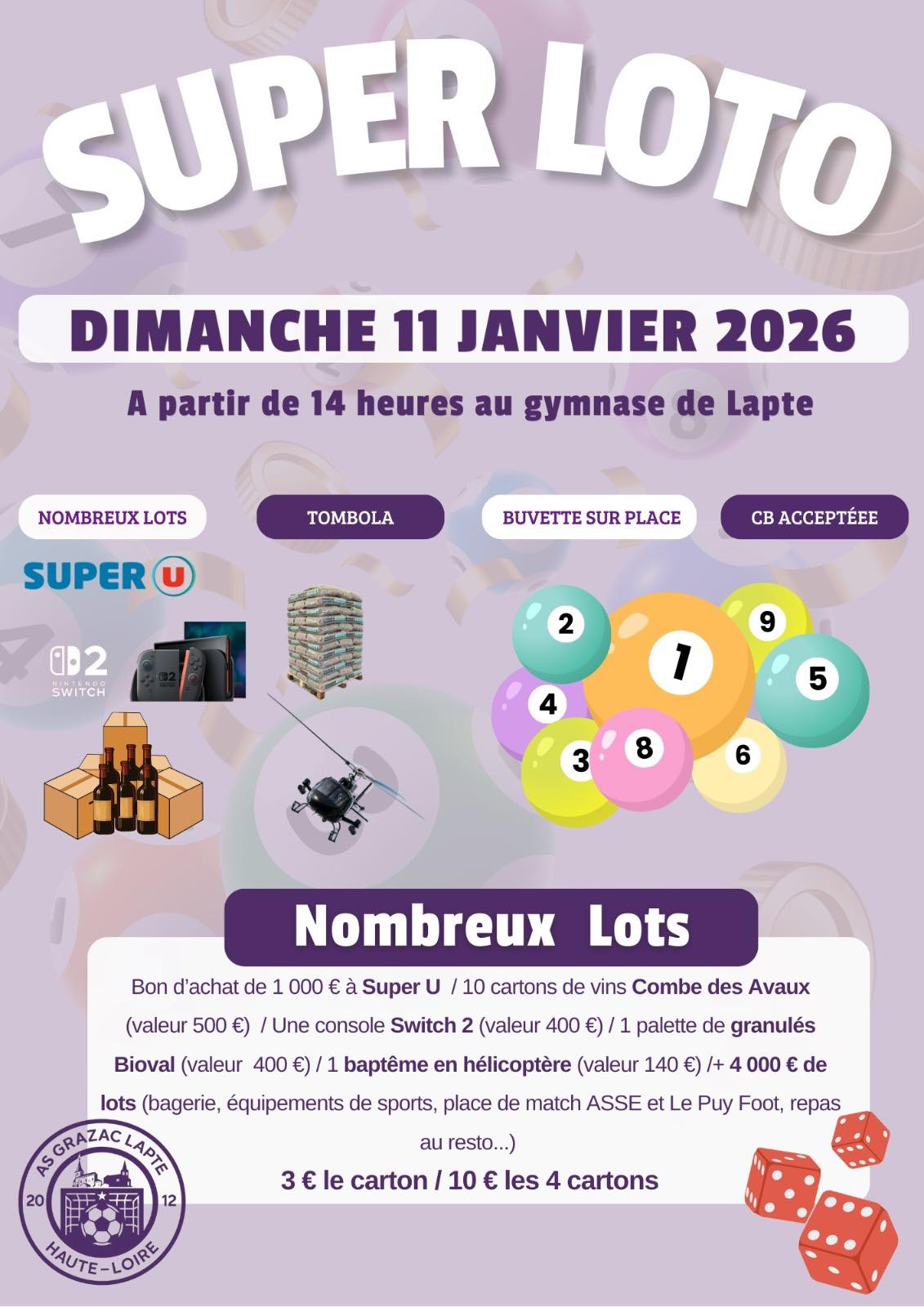 SUPER LOTO de l'AS Grazac-Lapte. Nombreux lots - Tombola - Buvette sur place