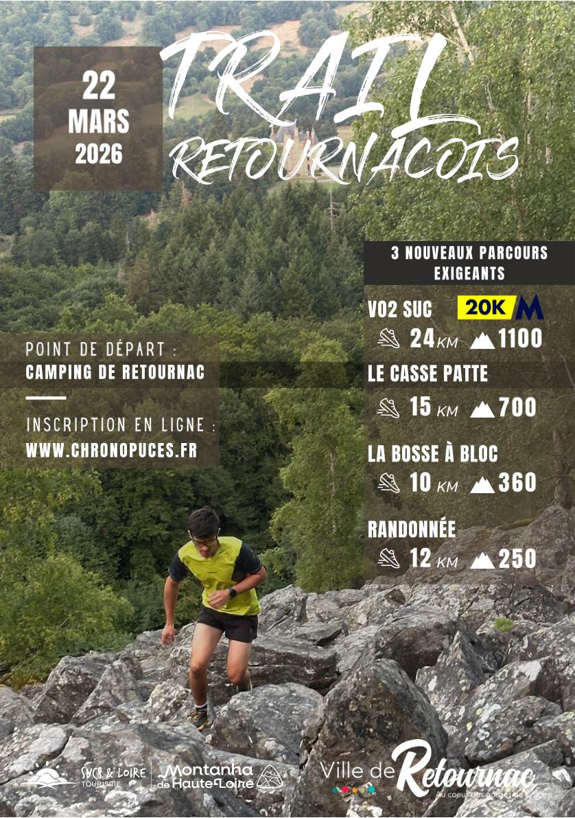 Aventure Retournac propose 3 parcours de Trail le 22 Mars 2026 à Retournac, distances de 10Km dénivelé de 360m "la Bosse à bloc", de 15Km dénivelé de 700m "le Casse Patte"et de 24Km dénivelé de 1100m "VO2 Suc". Règlement et inscriptions sur chronopuces.fr. Départ sur les bords de Loire sur l'aire du camping.