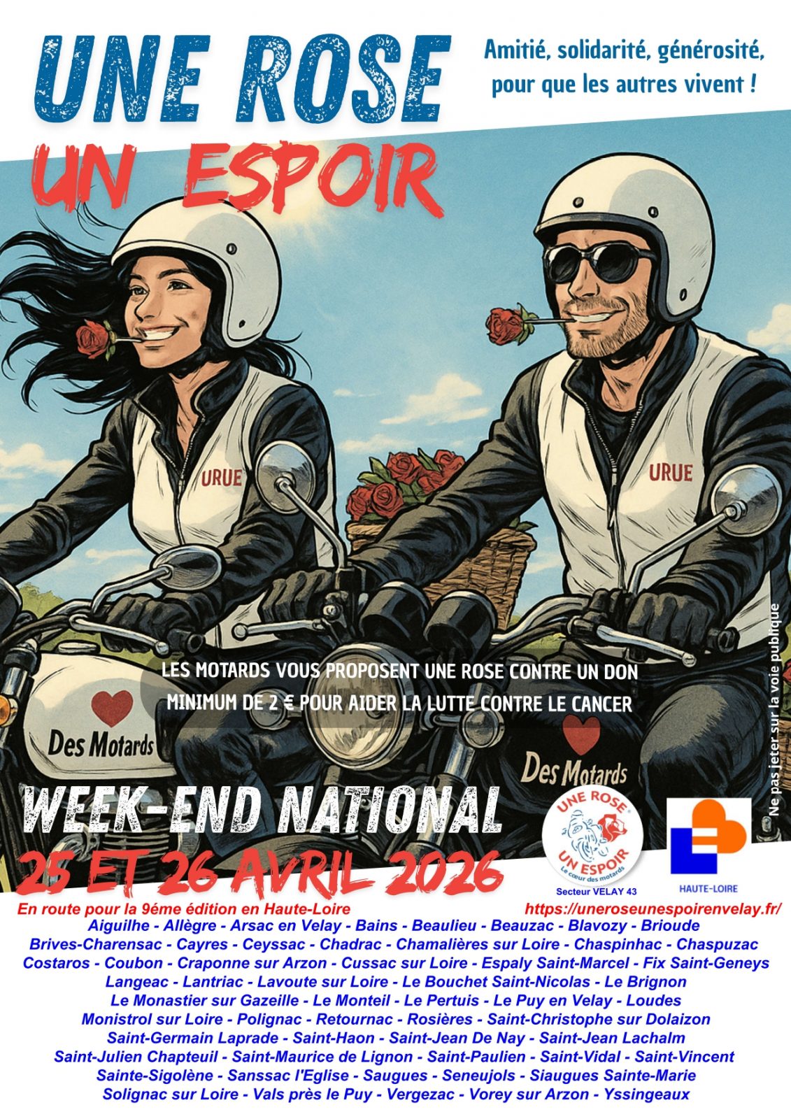 En route pour la 9ème édition en Haute-Loire, les motards vous proposent une rose contre un don minimum de 2 € pour aider la lutte contre le cancer. L'événement se déroule dans de nombreuses communes de la Haute-Loire.