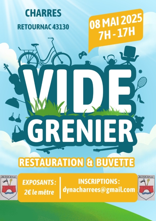 Vide grenier au village de Charrées, avec restauration et buvette sur place. Inscriptions par email.