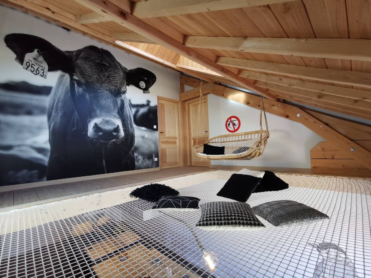 Au premier étage un coin détente est aménagée avec un filet suspendu au dessus d'une mezzanine, de deux chambres équipées de lit en 160, d'un dortoir équipé de 4 lits en 90 que viennent compléter deux lits superposés en 90 également, une salle d'eau et un WC.