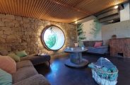 L'entrée se fait par un hall desservant la pièce de vie principale équipée d'une cuisine tout confort avec une vaste table à manger et un coin salon organisé autour du hublot et offrant une vue imprenable sur la campagne alentour.