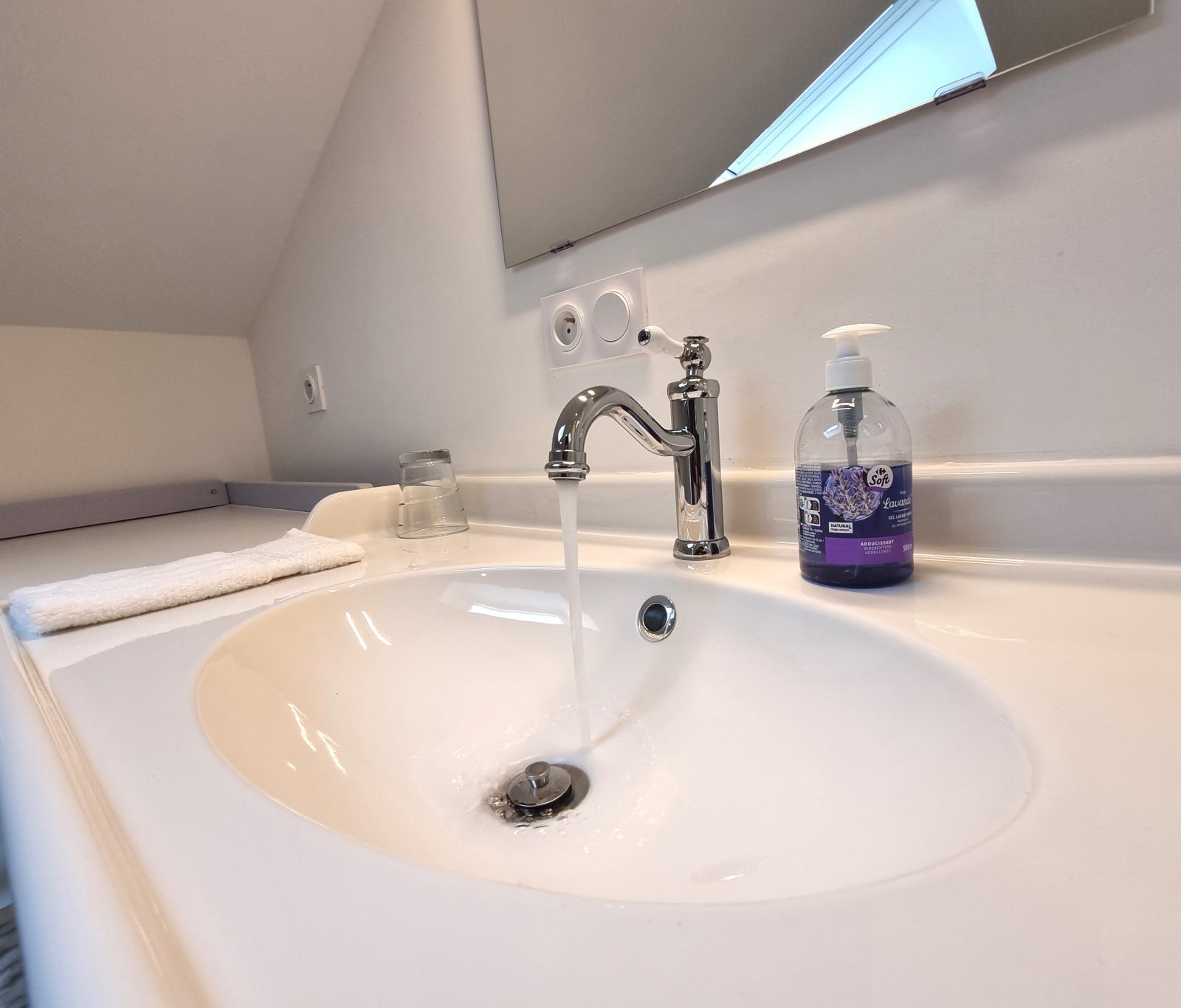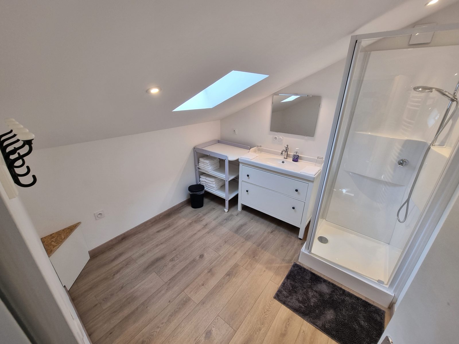 Salle d'eau : cabine de douche en 70*70, vasque sur meuble, sèche-cheveux, sèche-serviettes électrique, rangements, VELUX, VMC, ...