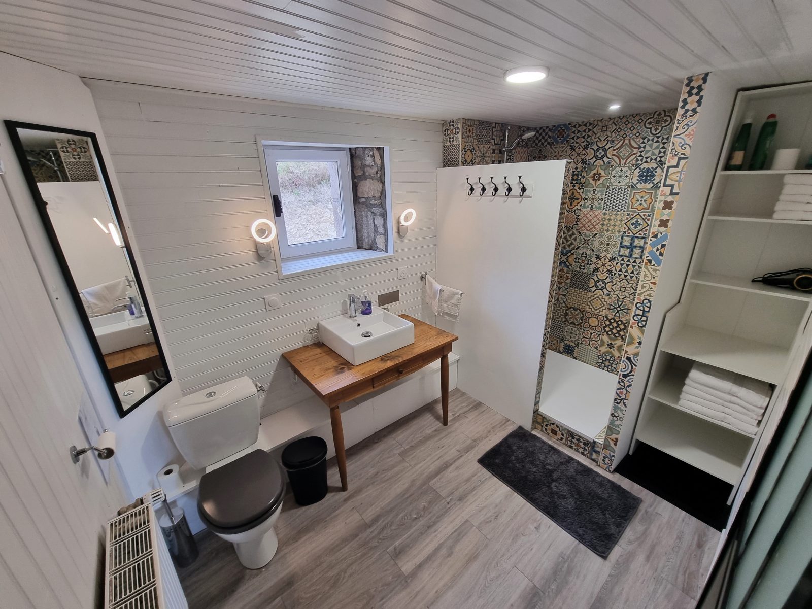 Salle d'eau avec WC : douche grand format en 120*80, vasque sur meuble, sèche-cheveux, WC, fenêtre, VMC, radiateur électrique, rangements, ...