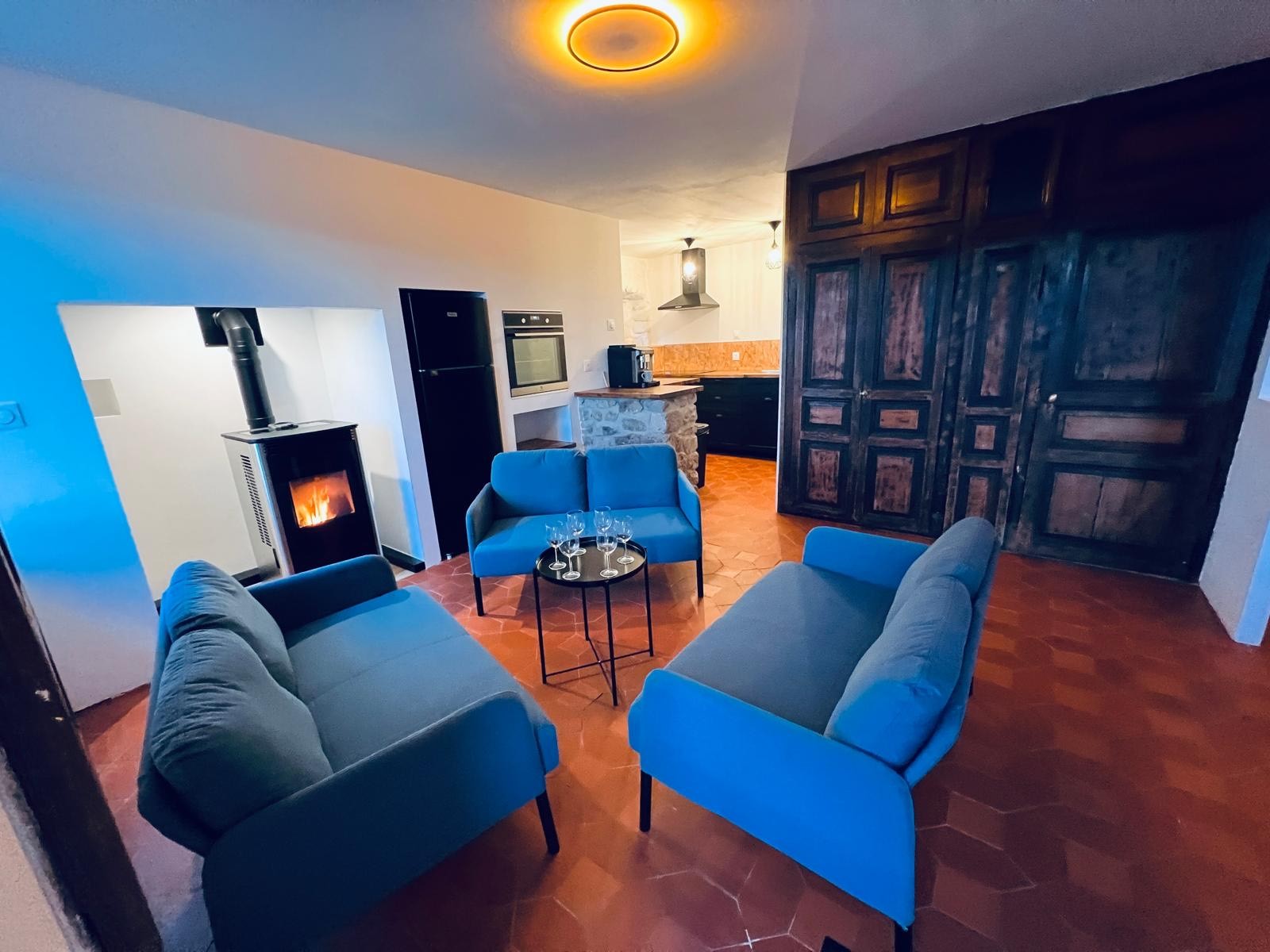 Espace salon : 3 canapés, table basse et poêle à granulés neuf !